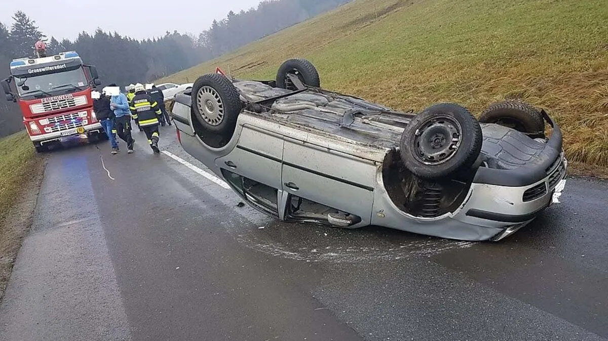 Ein Südoststeirer überschlug sich mit seinem Pkw auf der L454 zwischen Großwilfersdorf und Söchau. Feuerwehren, Polizei und Rettung waren im Einsatz.