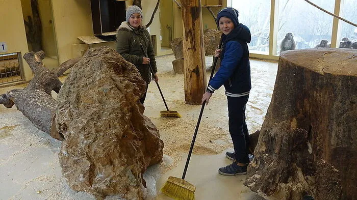 Jakob und Elena halfen Pfleger Christian Übel im Affengehege