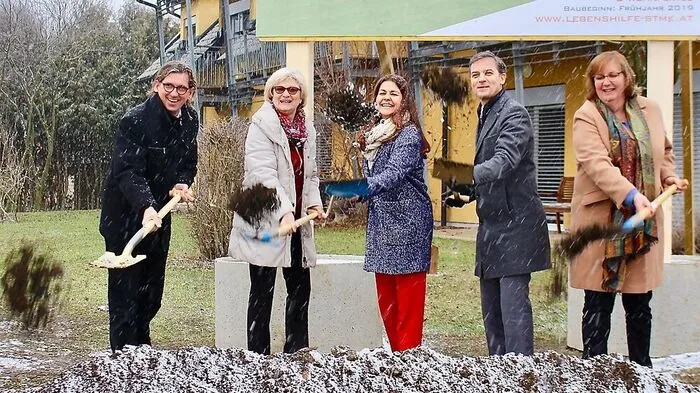 Architekt Georg Keler, Lebenshilfe-Obfrau Heidrun Notbauer, Landesrätin Doris Kampus, Bürgermeister Wolfgang Dolesch und Manuela Schwingesbauer griffen zum Spaten