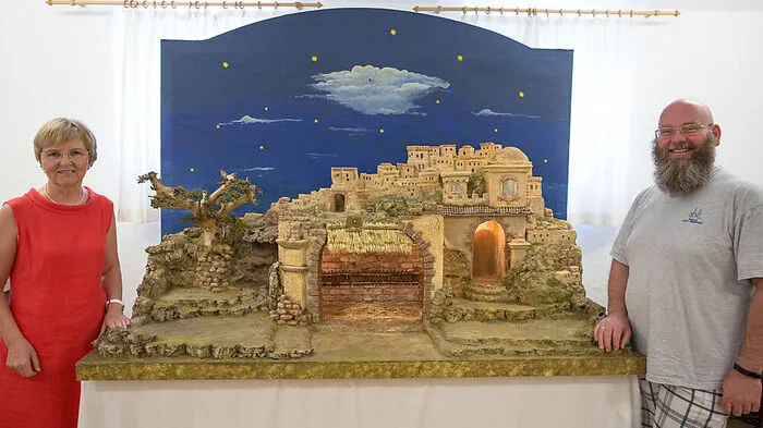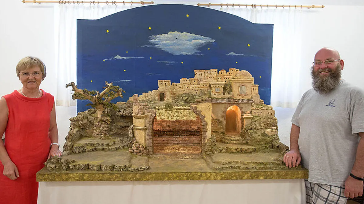Krippenbaumeisterin Waltraude Lechner und Pastoralassistent Franz Wallner mit der restaurierten Mariatroster Krippe