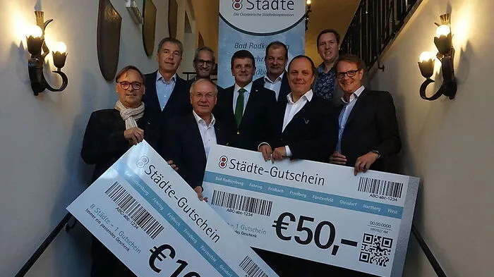 Die Bürgermeister der Oststeirischen Städtekooperation präsentieren stolz den neuen 50-Euro-Gutschein