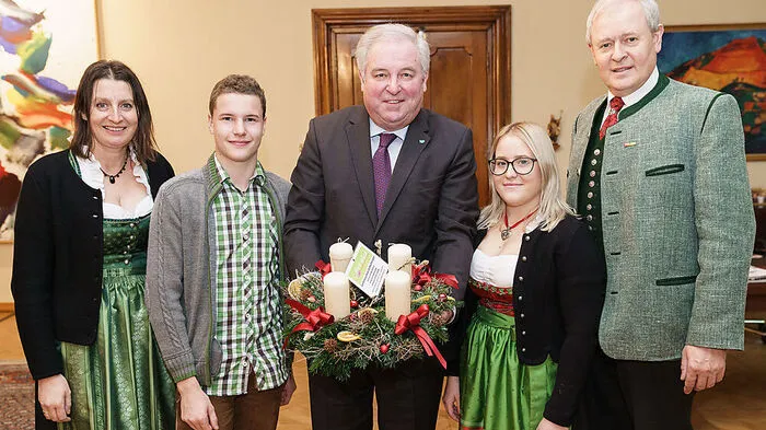 Schülerinnen und Schüler der Gärtnerischen Berufsschule Großwilfersdorf übergaben an Landeshauptmann Hermann Schützenhöfer einen selbst gefertigten Adventkranz.