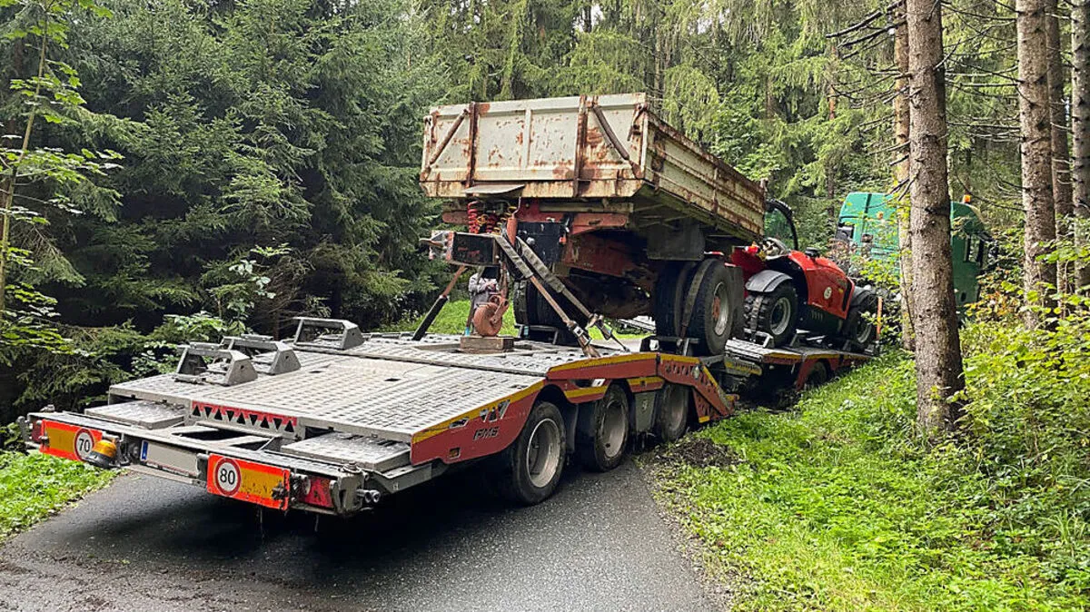 Auf einer Gemeindestraße im Pöllauer Ortsteil Winkl-Boden war am Dienstag ein Lkw mit Tieflader stecken geblieben. Die Freiwillige Feuerwehr Pöllau zog die Fahrzeuge aus dem Graben.