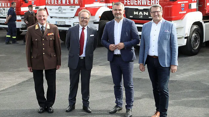 Feuerwehrkommandant Klaus Sabara, Bürgermeister Heinz Peter Krammer, Landesrat Heinrich Dorner und Alfred Kollar (OSG-Vorstand, Obmann).