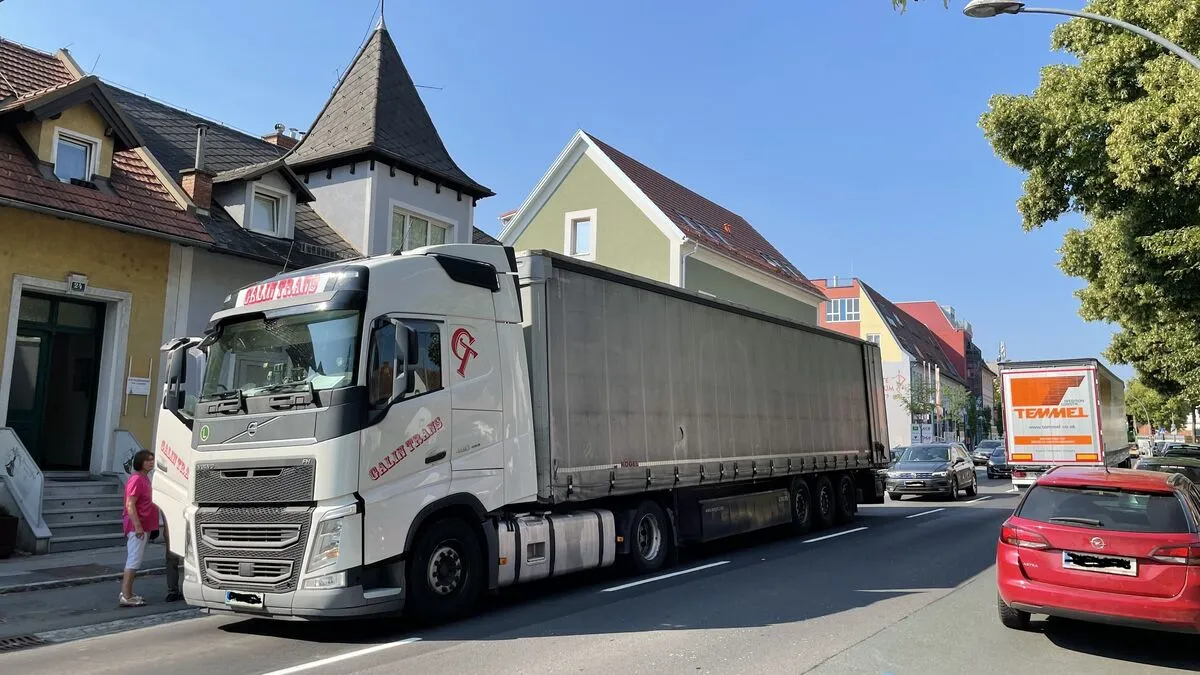 In Hartberg versperrt ein Lkw auf der B 54 Richtung Autobahnauffahrt die Fahrbahn. Deshalb geht es derzeit nur schleppend voran. Grund für den Stillstand ist ein Unfall mit einem ausparkenden Pkw.