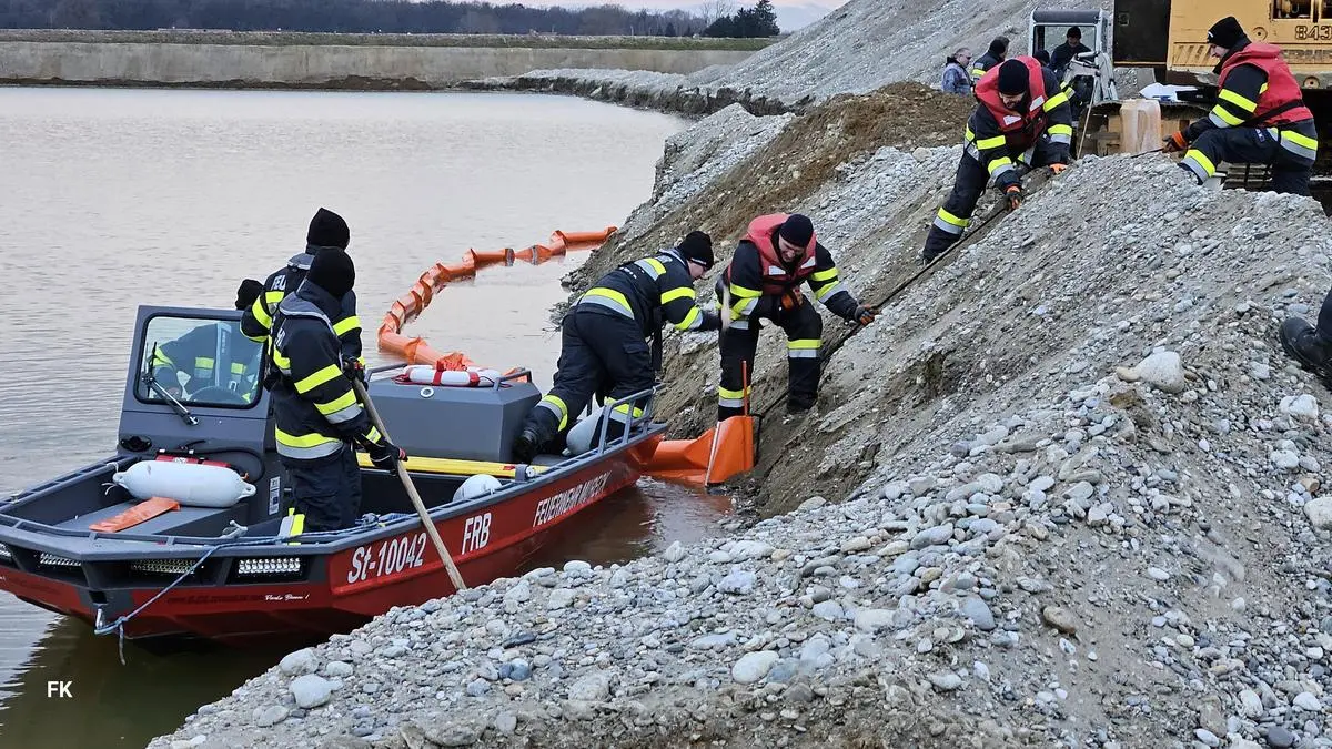 In Eichfeld (Gemeinde Mureck) verlor ein Bagger 80 Liter Hydrauliköl. Das Öl kontaminierte Schotter und Erdreich. Ein Boot zog im Teich eine Ölsperre auf.