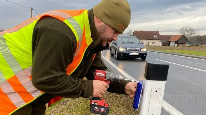 Unscheinbar sehen sie aus, die kleinen dunkelblauen Plastikstreifen, die an den Leitpfosten neben der B 69 in Halbenrain angebracht wurden. Und doch soll die Wirkung dieser optischen Reflektoren recht groß sein: „Es ist ein vergleichsweise simples Spiegelsystem, das in der Nacht Scheinwerferlicht in die Umgebung reflektiert. Fällt es einem Tier ins Auge, bleibt dieses reflexartig kurz stehen und läuft so nicht vor den Pkw“, erklärt Wolfgang Steiner, von der Interessensvertretung „Land- und Forstbetriebe Österreich“.