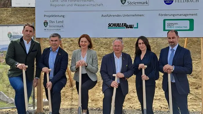 Am Oedter Bach (Stadtgemeinde Feldbach) wurde der Spatenstich für die Errichtung des Rückhaltebeckens gesetzt. 169 Objekte und rund 760 Menschen sollen damit vor Hochwasser geschützt werden.