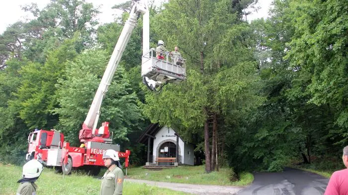 Am Sonntagnachmittag wurde durch die starken Regenfälle eine 30 Meter hohe Eiche in der Nähe des Freizeitzentrums Jennersdorf entwurzelt. Der mächtige Stamm blieb in Schräglage genau über dem Dach der Hubertuskapelle in einer Astgabel hängen. Es bestand die akute Gefahr, dass Autofahrer verletzt werden oder die Hubertuskapelle der Jägerschaft Jennersdorf zerstört wird. Ein aufmerksamer Autofahrer bemerkte die brenzlige Situation und alarmierte Polizei und Feuerwehr.