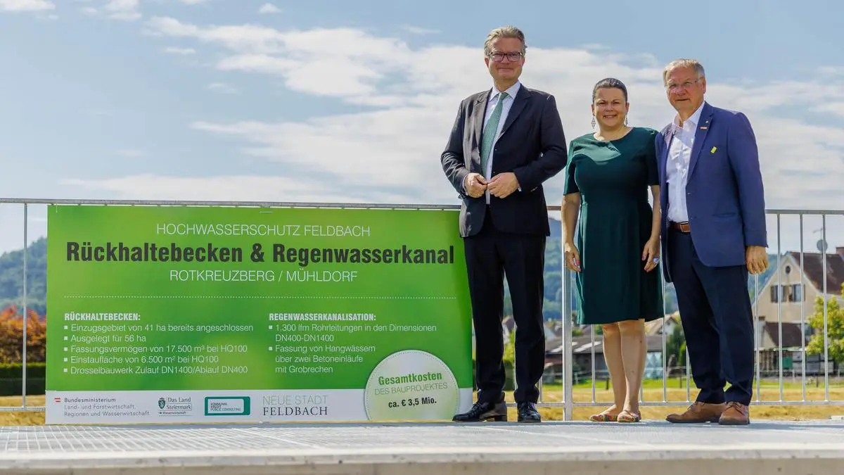 Ziemlich genau ein Jahr ist es her, seit verheerende Unwetter Teile der Steiermark und auch den Raum Feldbach überzogen und erst vor wenigen Wochen ereigneten sich wieder zahlreiche Überschwemmungen. Die Wissenschaft ist sich einig: Dazu wird es in Zukunft noch öfter kommen. „Deshalb werden jedes Jahr rund 55 Millionen Euro in den Hochwasserschutz investiert“, heißt es vonseiten des Landes Steiermark. Ein wesentliches Hochwasserschutzprojekt wurde kürzlich in Feldbach offiziell von Landeshauptmann Christopher Drexler und Bürgermeister Josef Ober eröffnet.