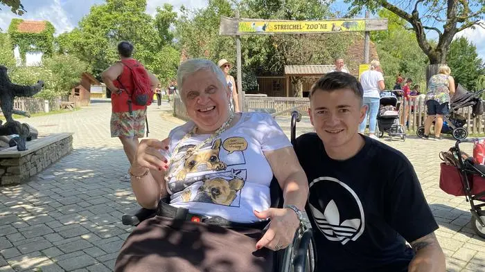 In der Luft liegt noch der feuchte Duft des Regens, ein Löwe blinzelt müde in die wenigen Sonnenstrahlen und wird dabei genaustens von Rosalinde Tieber (Rosa) beobachtet. „Ich bin großer Tierfan, schau gern Universum“, erklärt die 66-Jährige in der Tierwelt Herberstein. Sie beugt sich in ihrem Rollstuhl vor, um besser durch das Geländer zu sehen, doch da verschwindet die Raubkatze im Gebäude. „Du bist a Gauner“, kommentiert Tieber sichtlich genervt und bringt damit ihren Begleiter Kevin Maier zum Schmunzeln.