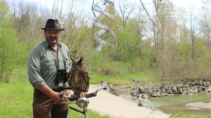 Hubert Tuscher aus Mureck sorgt mit seinem Uhu auf der Lenkerstange seines Fahrrads für Begeisterung und setzt sich dabei gleichzeitig für den Natur- und Artenschutz ein.