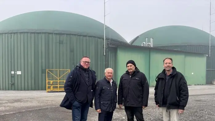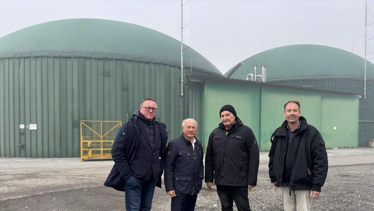 Halbenrains Vizebürgermeister Thomas Stacher, Vulkanland-Obmann Bürgermeister Josef Ober, Klaus Uidl und Christian Krotscheck vor der Biogasanlage der Firma Uidl