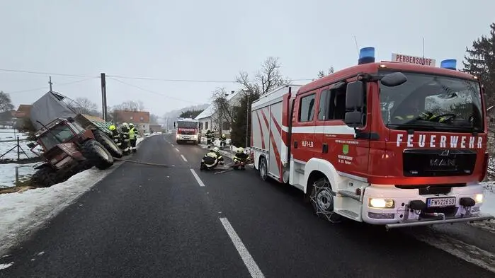 Am Samstagnachmittag kam es in Perbersdorf (Gemeinde St. Peter am Ottersbach) zu einem Traktorunfall. Das Fahrzeug wurde samt Anhänger von drei Wehren mit 29 Einsatzkräften aus dem Graben befreit.