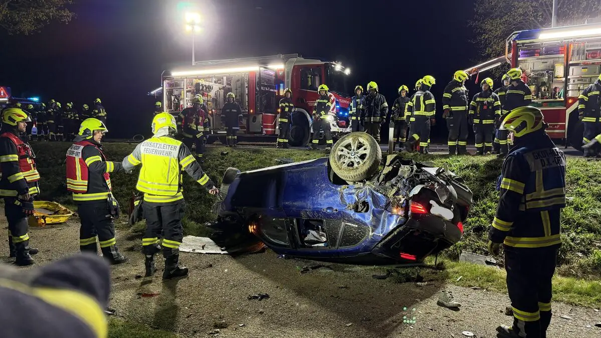 Gegen 20.15 Uhr kam ein Fahrzeuglenker auf der B 65 bei Rudersdorf von der Fahrbahn ab. Dabei prallte der Pkw gegen einen Baum, überschlug sich und kam schließlich auf dem Dach zum Stillstand. Die Feuerwehren Rudersdorf-Ort, Rudersdorf-Berg und Deutsch Kaltenbrunn rückten zu dem schweren Unfall aus. Da die erste Meldung „Verkehrsunfall mit eingeklemmter Person“ lautete, waren insgesamt 55 Einsatzkräfte mit acht Fahrzeugen vor Ort.