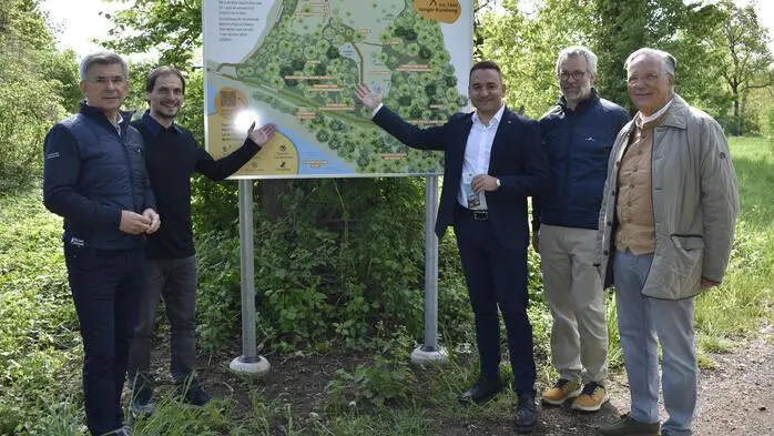 Regionsvorsitzender Stellvertreter Franz Fartek, Biosphärenpark-Manager Andreas Schuster, Regionsvorsitzender Michael Wagner, Regionalmanagement-Geschäftsführer Michael Fend und Bürgermeister Karl Lautner (v. l.) präsentierten das Erlebnisareal