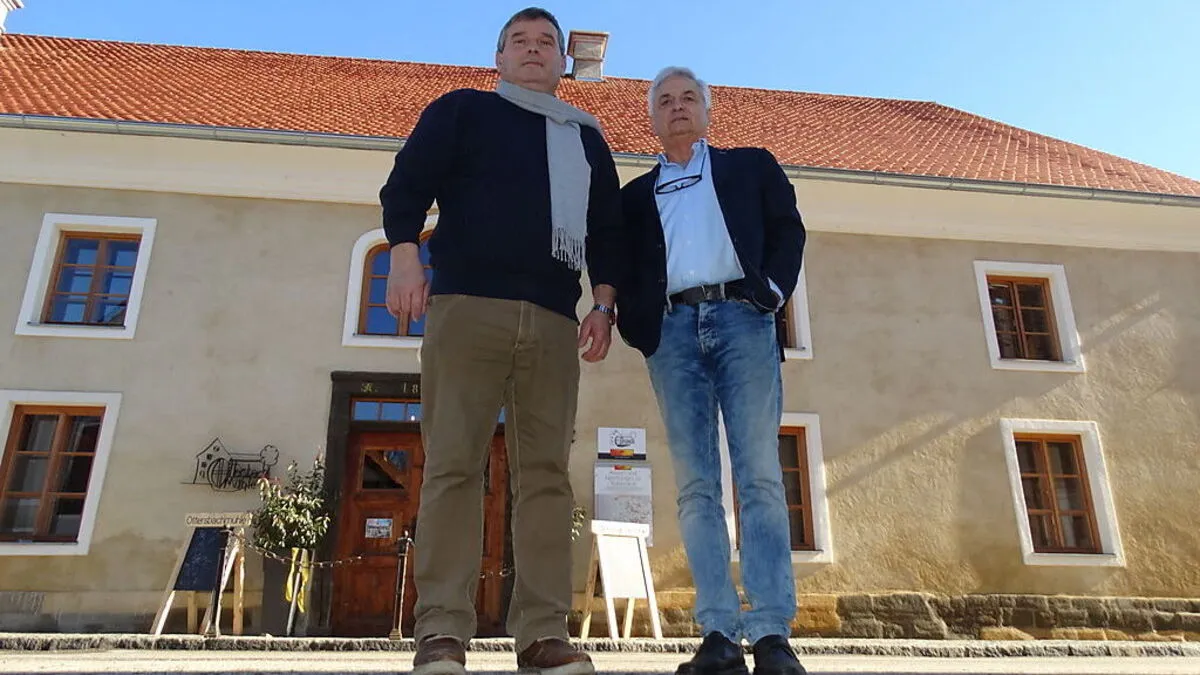 Rudolf Strohmaier (links) und Wolfgang Zoffel vor der Ottersbachmühle in Wittmannsdorf. Die soll in den nächsten drei Jahren um fünf Chalets und ein Hotel erweitert werden
