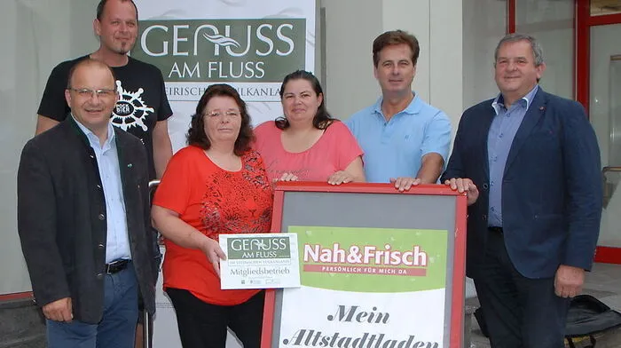 Monika und Bianca Frühwirth mit Georg Pock, Genuss am Fluss-Obmann (2.v.l.), Viktor Maitz (2.v.r.), Bürgermeister Heinrich Schmidlechner und Anton Gangl