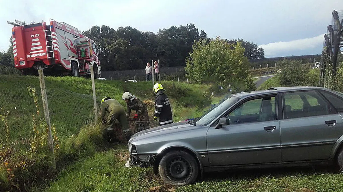 Pkw überholte nahe Riegersburg Bus, kam ins Schleudern und stürzte in Obstplantage. Insassen blieben unverletzt.