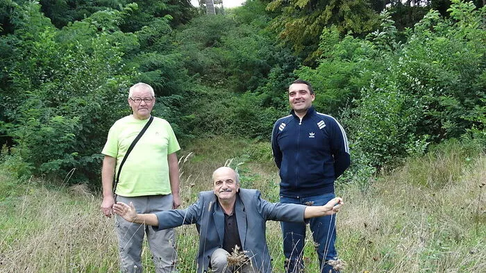 Die Natur hat längst die alte Schanze in Perto(c)a in Beschlag genommen. Nun wollen Jo(z)e Bertalani(c) (li.) und Gregor Filip (re.) aber ein Trainingszentrum für junge Skispringer errichten. Bürgermeister Drago Vogrincic (Mitte) würde das freuen