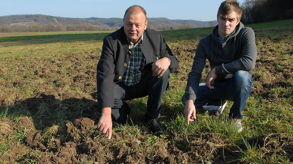 Wildschweine ackern im Raum Fehring Wiesen um. Rinderbauer beklagt Futterausfall und fordert stärkere Bejagung.