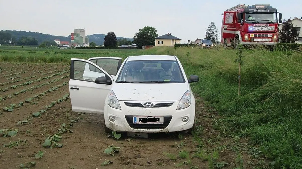 In Gniebing stürzte ein Pkw in einen Kürbisacker. Das Rote Kreuz versorgte die Insassen, die Feuerwehr barg den beschädigten Wagen.