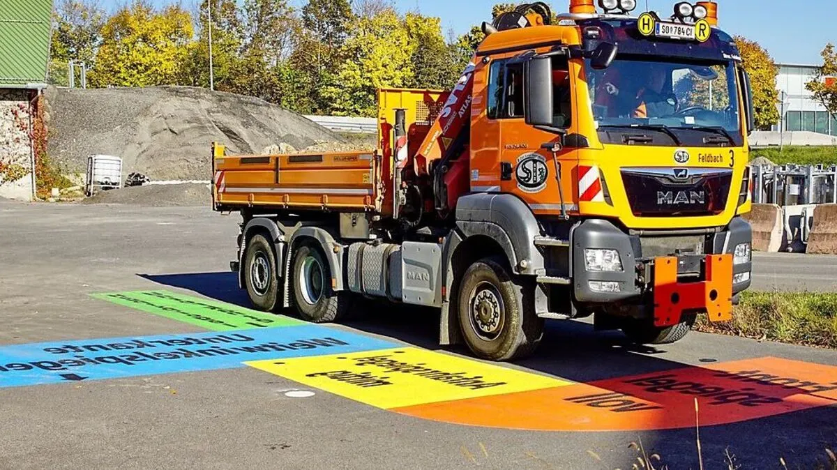 Gegen "Tote Winkel": In Feldbach gibt es jetzt einen „Spiegeleinstellplatz“. Markierungen auf dem Boden sollen helfen, Spiegel der Lkw optimal einzustellen.