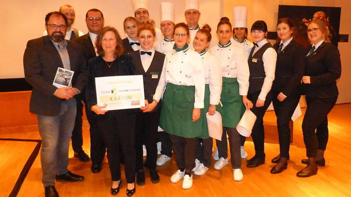 Am Ende des Abends wurde von den Tourismusschulen und dem Absolventenverein ein Scheck über stolze 3333 Euro an die Aktion „Steirer helfen Steirern“ der Kleinen Zeitung überreicht. „Dieses Essen ist ein wichtiges Projekt für unsere Schülerinnen und Schüler. Wir freuen uns, dass wir mithelfen können, für Menschen in diesem Land Gutes zu tun “, meinte Direktor Peter Kospach. Soeben aus Abu Dhabi zurückgekehrt wartet schon heute ein Einsatz bei der Weihnachtsfeier von Bayern München auf den touriristischen Nachwuchs.