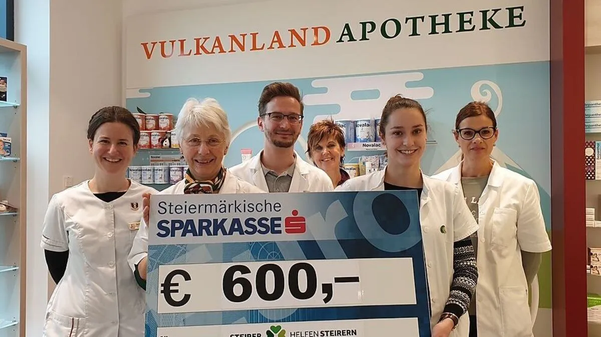 Deshalb haben Barbara Hofer und ihr Team von der Vulkanland Apotheke im Einkaufszentrum Mühldorf (Gemeinde Feldbach) zur Scheckübergabe gebeten: 600 Euro spendete die Apotheke an „Steirer helfen Steirern“. Die Benefizaktion der Kleinen Zeitung greift Steirerinnen und Steirern unter die Arme, die in eine Notsituation geraten sind. Die Apotheke hatte im Mai 2018 ihre Pforten geöffnet und hat auch im Vorjahr die Benefizaktion mit 500 Euro unterstützt.