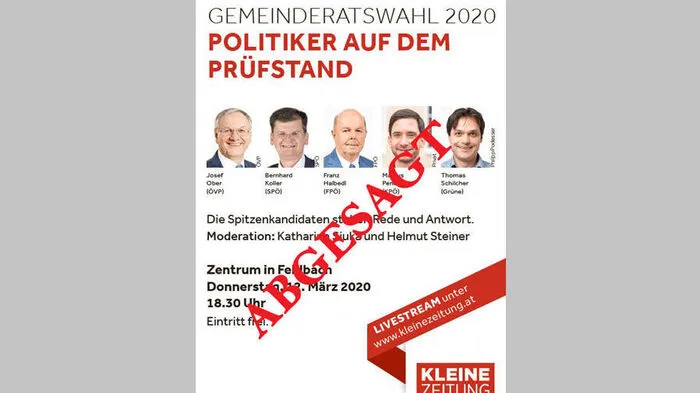 Das Land Steiermark hat Donnerstag am Nachmittag, 12. März, die Gemeinderatswahl am 22. März abgesagt. Sie wird wohl in den Herbst verschoben. Aus diesem Grund findet auch die Wahldiskussion der Kleinen Zeitung in Feldbach am Donnerstagabend nicht statt.