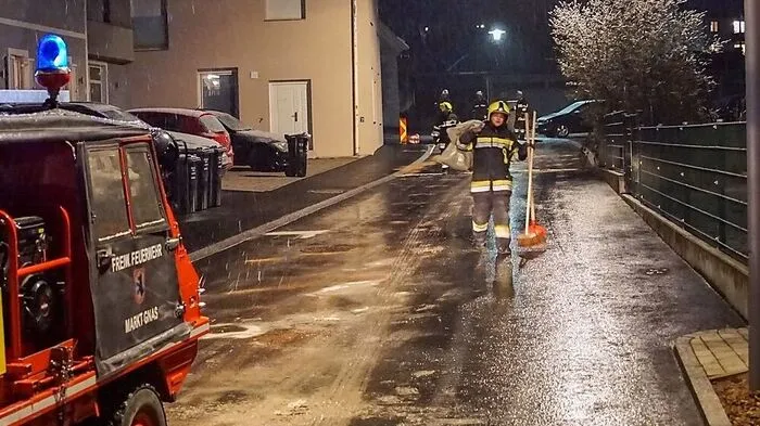 Feuerwehr Gnas musste Müllladegut löschen. Dann verlor ein Pkw Diesel, der in Regenwasserkanal geriet. Feuerwehren Gnas und Bad Gleichenberg waren stundenlang im Einsatz, um weitere Ausbreitung des Treibstoffs in Bach zu verhindern.