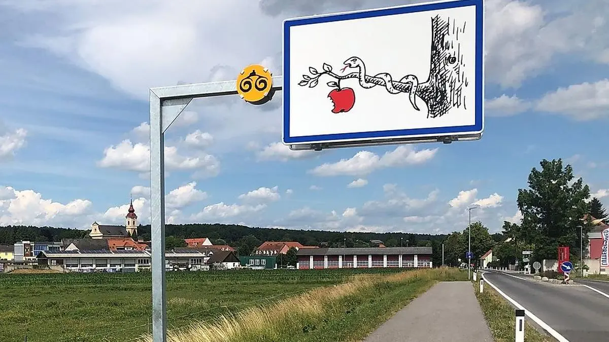 Wer dieser Tage in Ilz auf der B66 in Richtung Süden fährt, wird sich womöglich schon über ein seltsam anmutendes Verkehrsschild gewundert haben: Eine Schlange und ein angebissener, roter Apfel auf weißem Hintergrund, mit gewohntem, blauen Rahmen. Daneben ein kreisrundes, gelbes Schild mit der Silhouette der Riegersburg. Was damit dargestellt werden soll, fragt sich ein Nutzer auf der Videoplattform YouTube und scheint wenig Gefallen an den Straßenschildern zu finden.