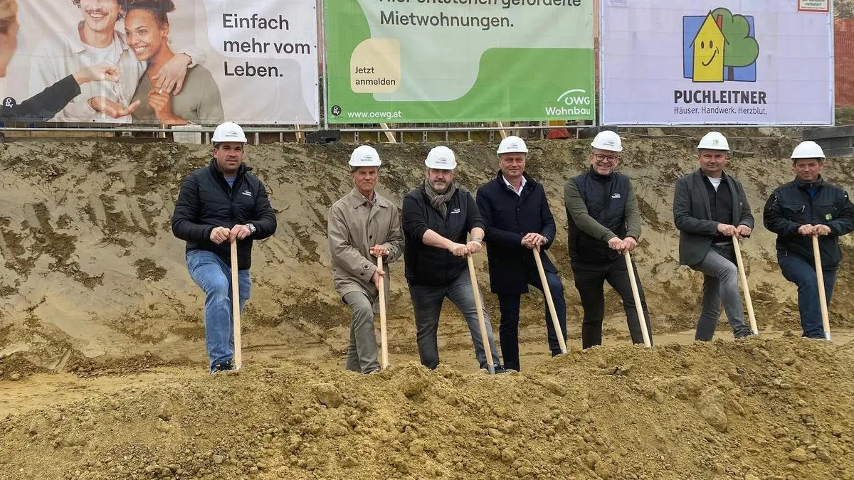 Spatenstich mit Matthias Wacker (ÖWG), Karl Puchleitner (GF Puchleitner Bau), Heinz Zischka (ÖWG), Bürgermeister Manfred Reisenhofer, Carl Puchner (ÖWG), Franz Platzer (Bauleiter Puchleitner Bau) und Hannes Krois (Polier Puchleitner Bau)