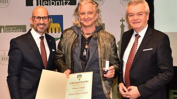 Unter den Geehrten: Blues-Sir Oliver Mally (m.) mit Bürgermeister Michael Schumacher (l.) und LH-Stv. Anton Lang (r.)