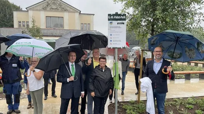 Der G.-W.-Pabst-Park in Leibnitz wurde bei strömendem Regen eröffnet