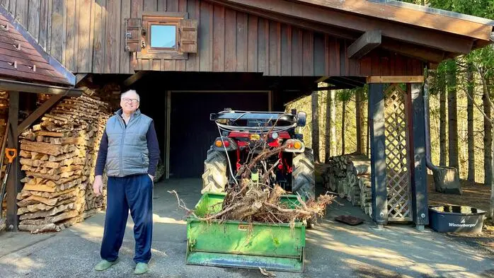 Das Bild zeigt Ewald Paar vor der betroffenen Garage auf seinem Grundstück in Vochera am Weinberg, Deutschlandsberg | Ewald Paar vor der betroffenen Garage auf seinem Grundstück in Vochera am Weinberg, Deutschlandsberg