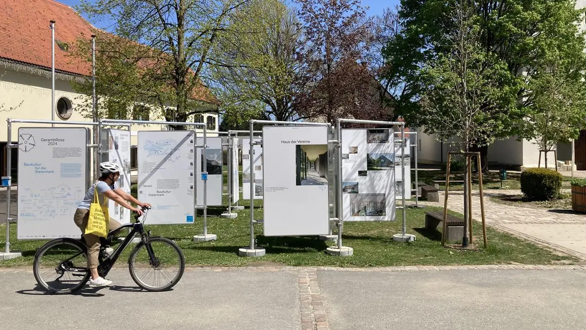 Das Bild zeigt die Siegerprojekte am Gamlitzer Kirchplatz und eine Radfahrerin. | Die Siegerprojekte werden am Gamlitzer Kirchplatz ausgestellt