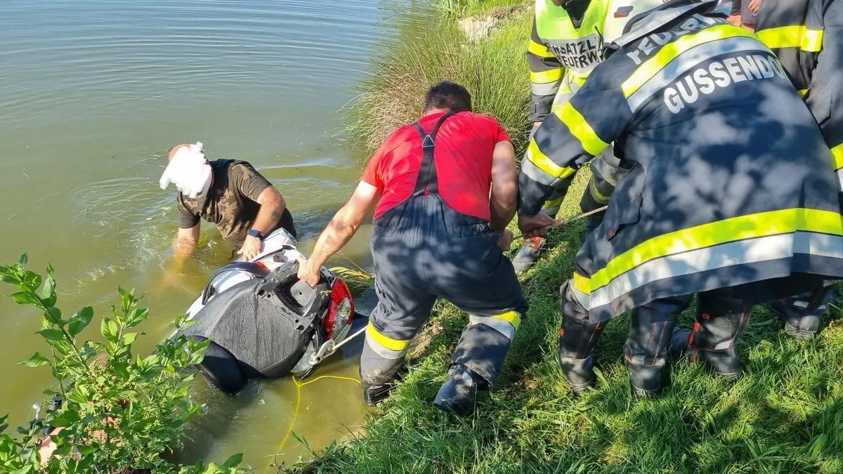Um die Bergung des im Teich versunkenen Motorrades kümmerte sich die Freiwillige Feuerwehr Gussendorf, die mit 15 Einsatzkräften und drei Fahrzeugen ausgerückt war.