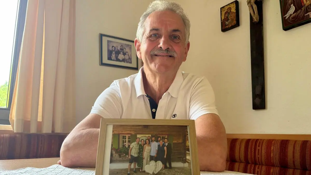 Franz Windisch (66) Zuhause am Küchentisch mit einem Foto seiner sieben Kinder und ihm selbst. Seine Frau ist vor wenigen Jahren verstorben