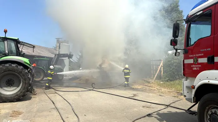 Die Freiwillige Feuerwehr Gamlitz wurde Dienstagnachmittag gegen 13.20 Uhr zu einem Brandeinsatz in Sernau, Gemeinde Gamlitz, alarmiert. Auf einem landwirtschaftlichen Betrieb hatte der Besitzer kurz zuvor Rauch an seinem Traktor mitsamt eines mit Strohballen beladenen Anhängers entdeckt.