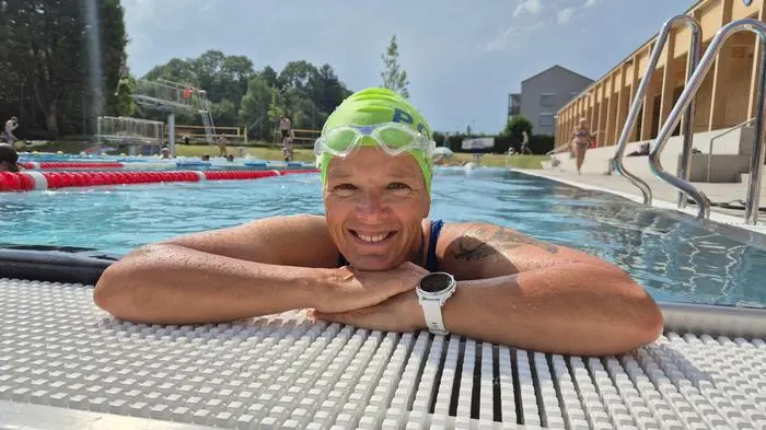 Claudia Müller im neuen Stainzer Freibad und dem Ort, wo sie als Kind schwimmen lernte