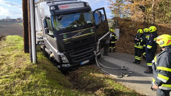 Ein aufmerksamer Nachbar und langjähriger Kommandant der Feuerwehr Preding alarmierte seine Kameraden, die sich schon bei der Anfahrt auf eine aufwändige Bergung vorbereiteten. Zum Glück war der Lkw nicht beladen, weshalb der Traktor eines Feuerwehrmannes ausreichte, um die Zugmaschine aus dem Straßengraben zu ziehen.