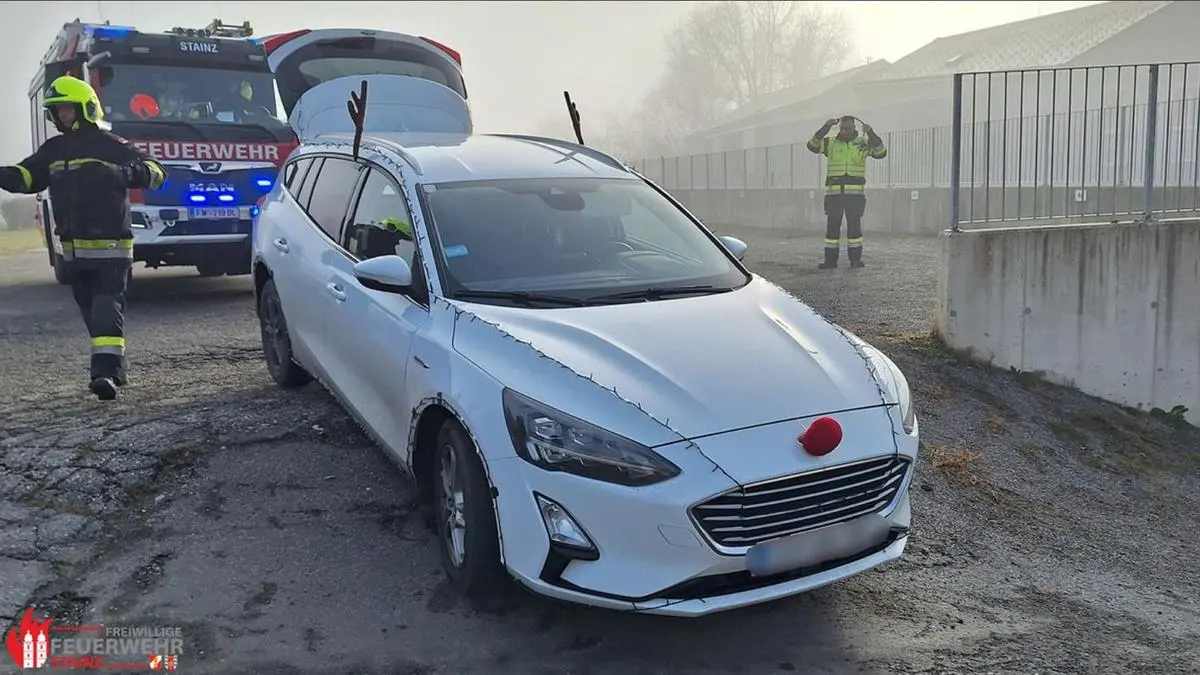 Geweih, rote Nase und Lichterkette: Ein weihnachtlich dekorierter Pkw blieb am Schulparkplatz in Stainz stecken. Für die Feuerwehr ein spezieller Einsatz.