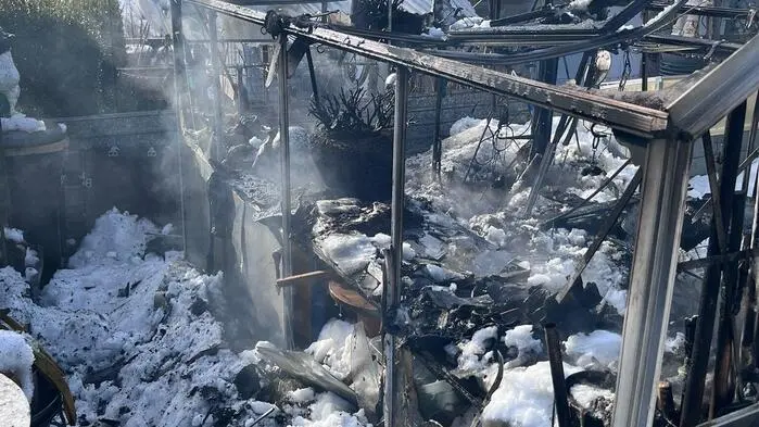 In einem Garten geriet ein gläsernes Gewächshaus in Brand