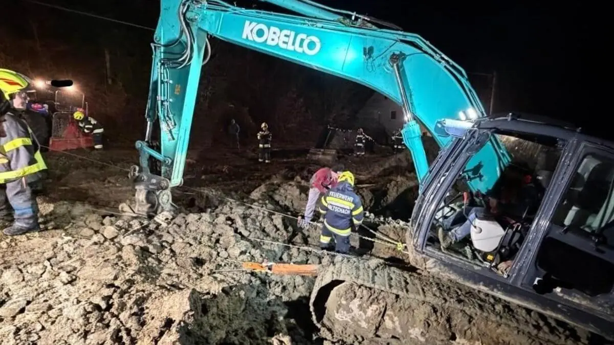Die Bergung gestaltete sich entsprechend aufwendig, wie es heißt. Es brauchte mehrere Seilwinden, die teilweise über Flaschenzüge umgelenkt wurden. Vier umliegende Landwirte unterstützten die Einsatzkräfte zusätzlich mit ihren Traktoren bei der Zugleistung. Mit einer Gesamtzugleistung von mehr als 20 Tonnen konnte der Bagger schließlich befreit werden.