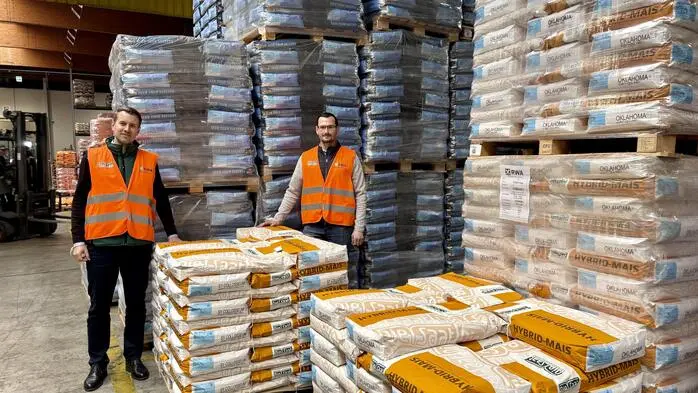 Abteilungsleiter Christoph Schwindhackl (links) und Standortleiter Engelbert Aust in der Halle von RWA Lannach: Allein in der Vorwoche wurden von hier rund 2000 Paletten Saatgut an die Lagerhäuser ausgeliefert.