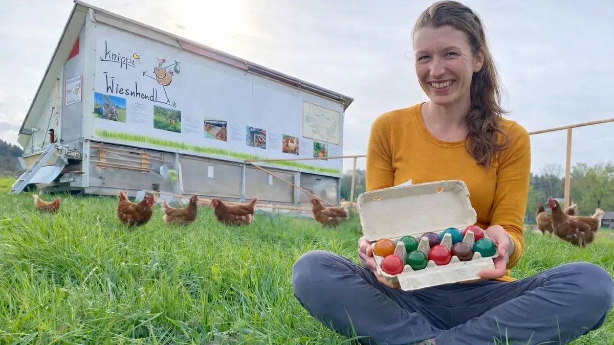 Petra Knippitsch von „Knippi Wiesenhendl“ vor einem ihrer mobilen Hühnerställe in Wildon: Mit ihren Ostereiern wirbt die Direktvermarkterin für regionale Herkunft und bewussten Einkauf.