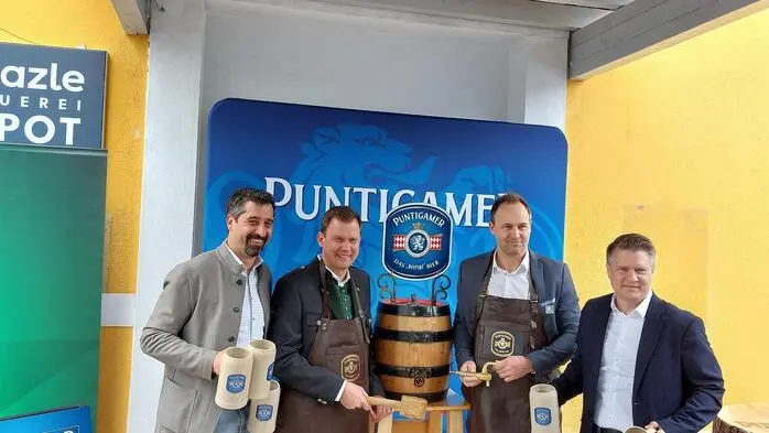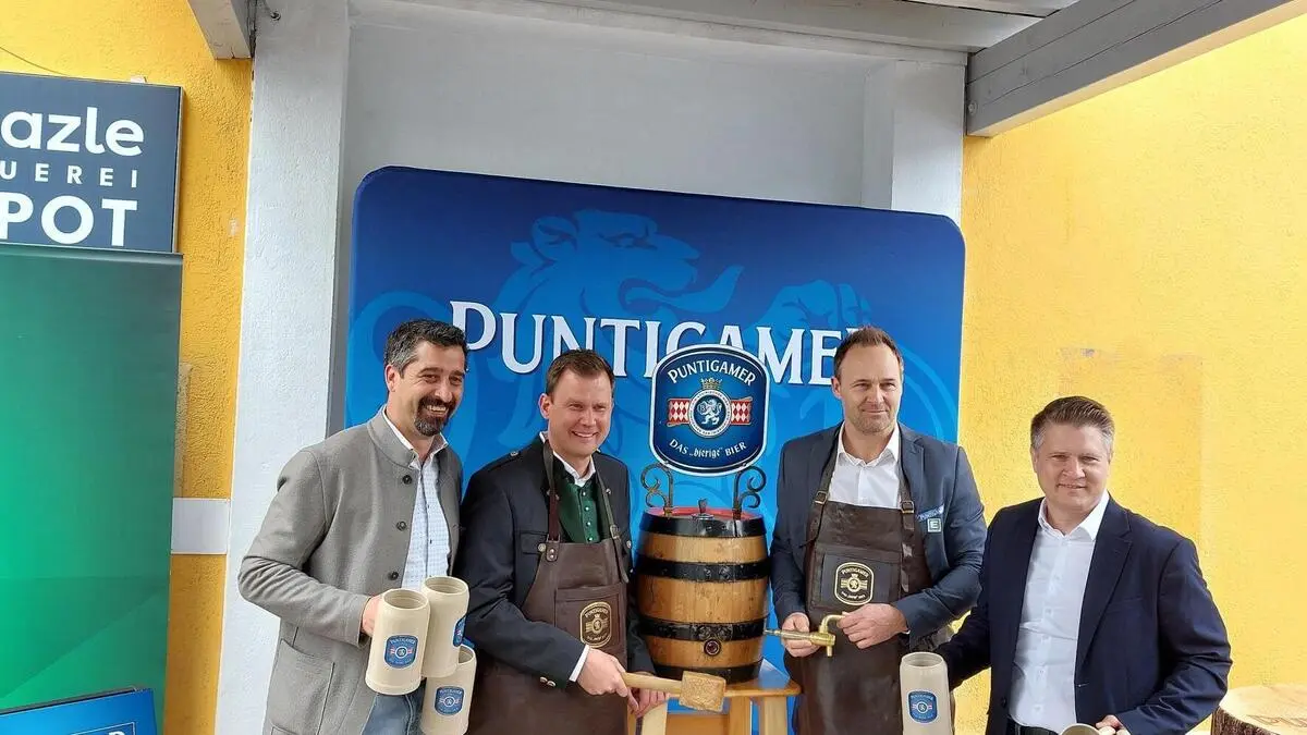 Bürgermeister Daniel Kos mit Vertretern der Brau Union beim Bieranstich zur Eröffnung