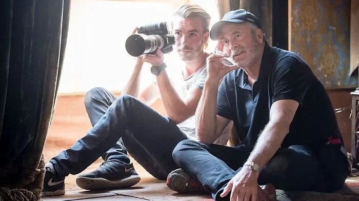 Starfotograf Greg Gorman (r.) gibt einem jungen Kollegen Tipps beim Shooting im Schloss Ehrenhausen