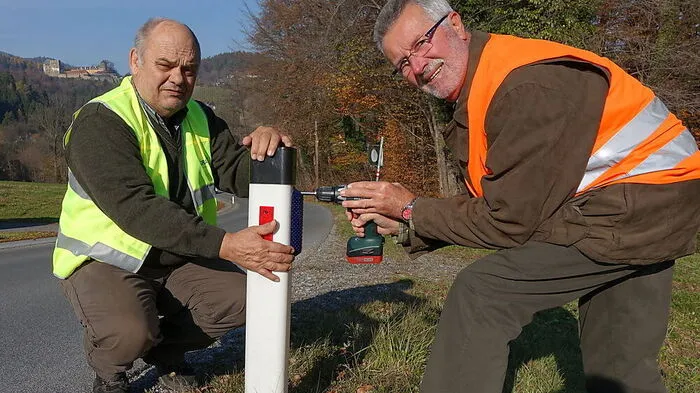 Gemeindejagd-Obmann Reinhold Langer und Jäger Arthur Faulhaber (li) montieren einen Wildreflektor